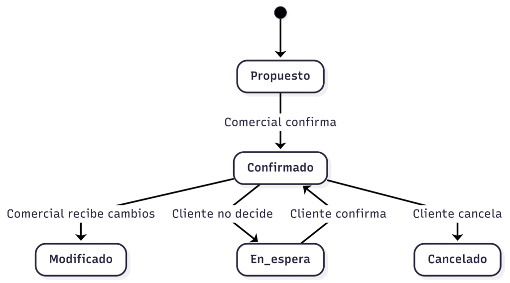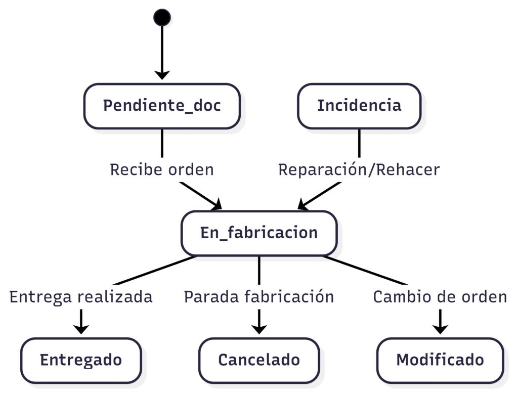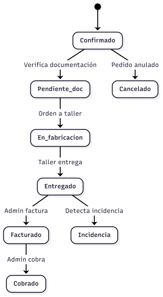 El pedido puede estar en estados como propuesto, confirmado, pendiente de documentación, en fabricación, entregado, facturado, cobrado, cancelado. Cada actor (comercial, administración, taller) interpreta y actúa sobre esos estados según sus responsabilidades, de modo que el mismo artefacto se percibe de manera distinta en cada área y no como un simple traspaso de testigo entre departamentos.